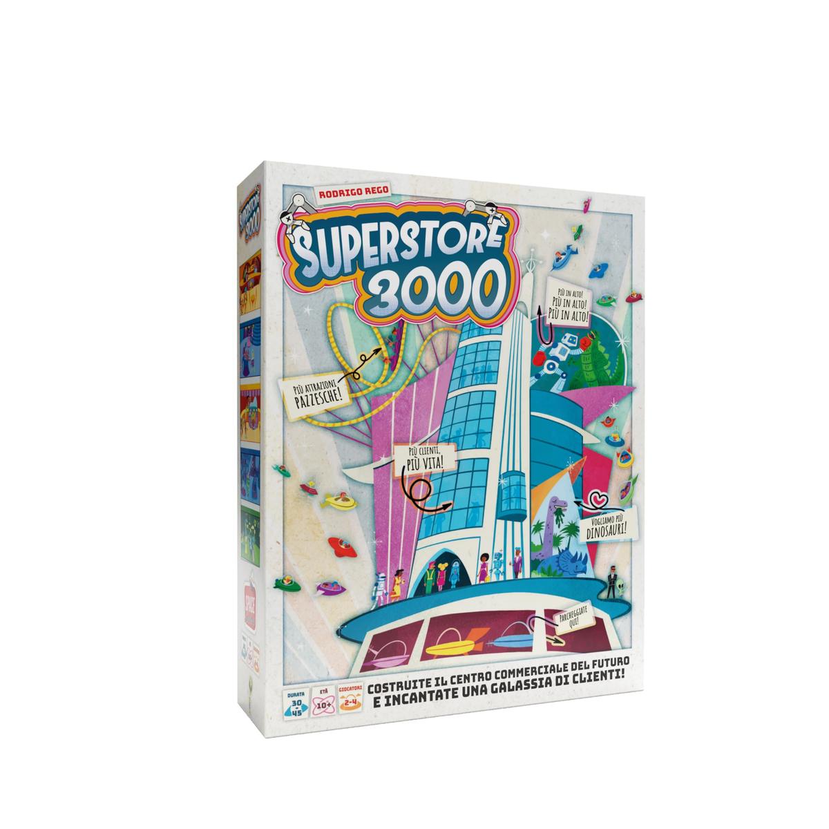 Corre lanno 2964 e i centri commerciali vanno molto di moda cosa c di meglio che trovare tutto ci che si desidera in un unico grande complesso commerciale? Lunico problema che stanno spuntando per tutta la galassia e lo Store Dispenser 3000 non riesce a stare al passo con la richiesta.Mentre le navette e gli shuttle arrivano alle zone di attracco, spetta agli ingegneri costruire unesperienza di shopping fatta su misura per i clienti entusiasti di arrivare ai loro centri commerciali. Questo approccio disordinato potrebbe portare ad alcune strutture bizzarre ma questo non importa, a patto che lesperienza risulti soddisfacente!In Superstore 3000 siete degli aspiranti ingegneri che competono per costruire il centro commerciale pi straordinario di sempre!Dovrete trovare la combinazione giusta di negozi e attrazioni per soddisfare i clienti che visitano la vostra creazione.A fine giornata, sar il centro commerciale pi innovativo ad avere successo. Riuscirete in questa impresa?SEMPLICE!Durante il vostro turno, svolgete unazione: aggiungete un nuovo NEGOZIO al vostro centro commerciale oppure guadagnate DENARO!STRATEGICO!Attraete una GALASSIA DI CLIENTI! Pi saranno felici, pi VOI sarete felici!SPETTACOLARE!Raggiungete il maggior numero possibile di obiettivi per costruire fantastiche ATTRAZIONI!Contenuto:96 tessere Elemento Centro Commerciale, 1 Dispenser 3000, 56 segnalini Cliente, 16 carte Attrazione, 14 tessere Attrazione, 4 tessere Entrata Principale, 1 plancia Zona di Attracco, 8 tessere Zona di Attracco, 12 tessere Denaro di Partenza, 12 segnalini Palloncino, 4 righelli, 1 pedina Primo Giocatore.
