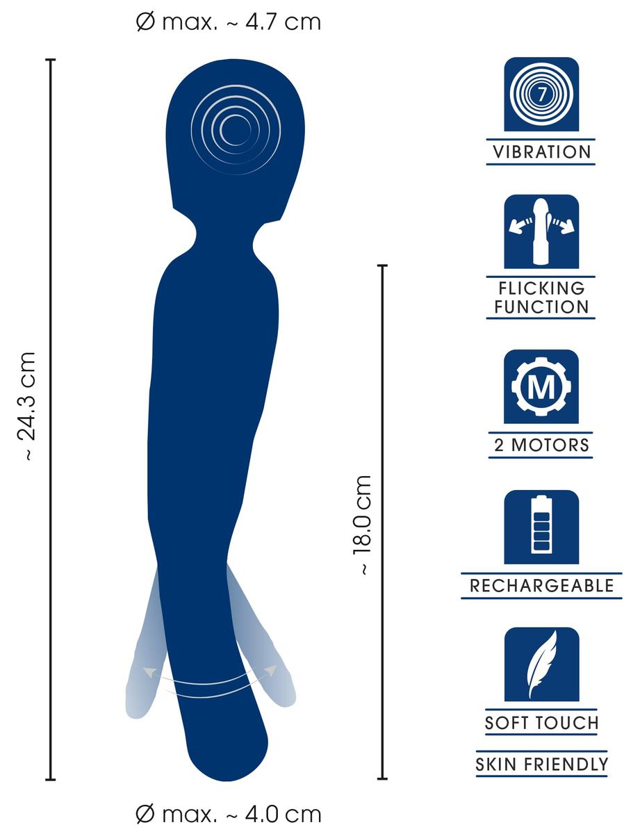 A powerful multi-functional toy for diverse pleasure and play alone or with a partner! The 2in1 Wand with Flicking Tongue from Sweet Smile is a massage wand in an elegant design which is perfect for internal and external stimulation. Both ends of the wand can be used. Its flexible massage head stimulates all of the body's erogenous zones. Its long and ergonomically-shaped handle can also be used as a sophisticated Flicking Tongue stimulator that can be inserted vaginally or anally. The soft, grooved tongue can then pleasure this area with its knocking impulses when it moves back and forth! The 2 powerful but quiet motors provide 7 vibration modes in the massage head and 7 speeds for the Flicking Tongue in the shaft. These modes and speeds are perfect for extremely diverse pleasure. The modes and speeds can be easily adjusted at the push of a button. The wand is made out of velvety soft silicone and this means that it glides over the skin almost on its own. The shaft can be easily insert and the flexible massage head caresses any area on the body or in the intimate areas. Exclusive pleasure for enormous satisfaction! Rechargeable includes a USB cable. Total length 24.3 cm, of massage head 4.7 cm. Handle: insertion length max. 18 cm, max. 4 cm. Weight 227 g. Silicone, ABS, PU.