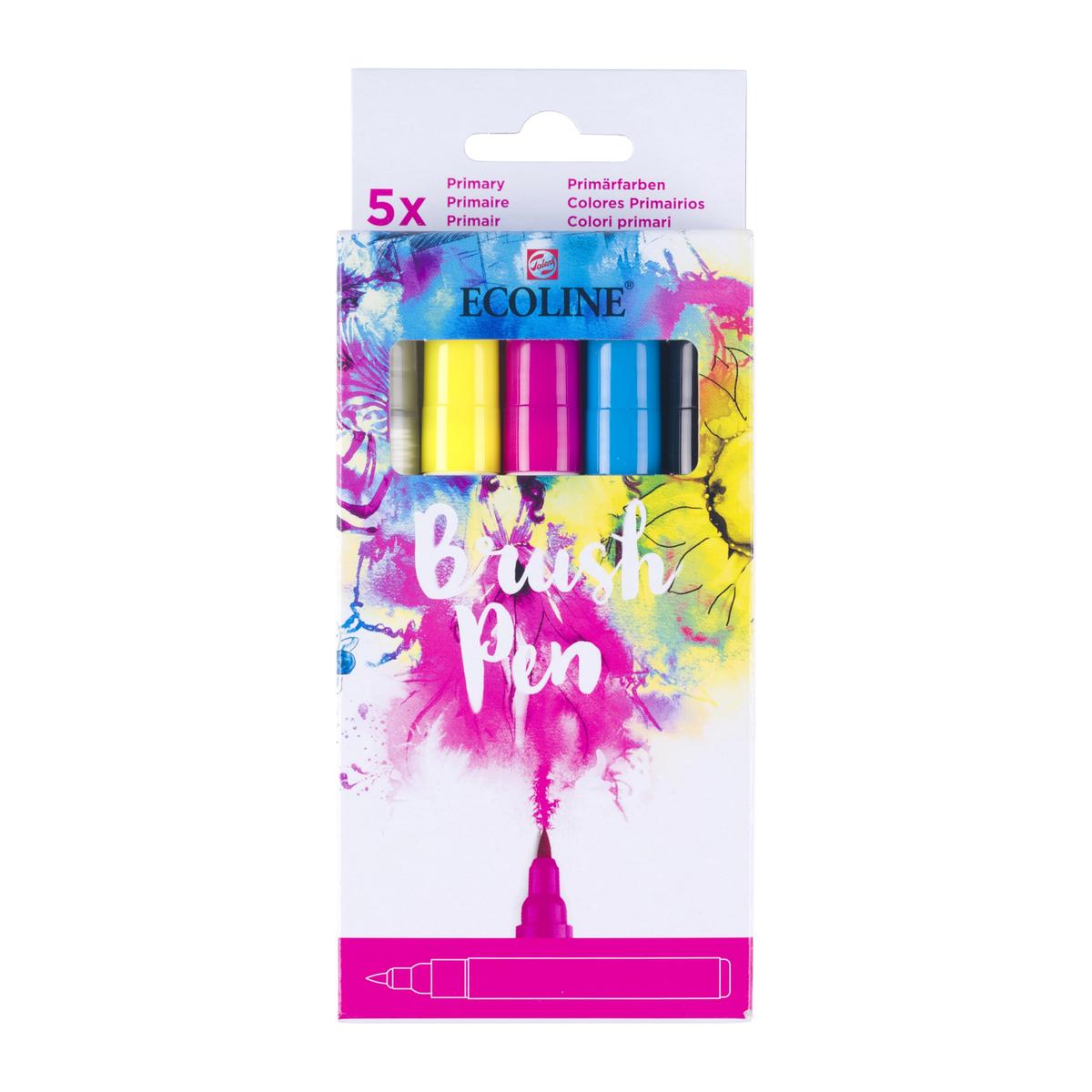 Talens Ecoline Brush Pen Set of 5 - Pastel is based on dyes and Gum arabic. The colours of Talens Ecoline are astonishingly bright and brilliant. If you wish, you can easily decrease the colour intensity through thinning with water or with the Brush Pen blender (separately available). Store the original works of art in a portfolio for optimal colour retention.The concentrated formula of the Talens Ecoline in the Brush Pens ensures for a seamless transition with the Talens Ecoline from the bottles. Using the special Brush Pen blender, colours can be mixed or subdued, and some wonderful wash effects and colour transitions can be created. Forgotten to put the cap back on? A dried brush tip can be easily saved by moistering it with some water.