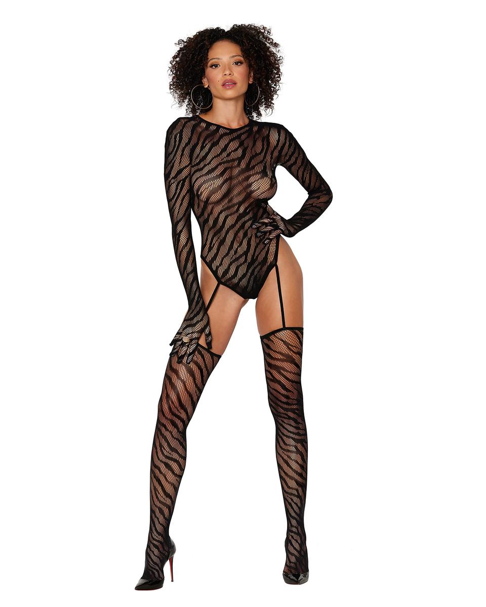 Teddy Bodystocking with Finger Gloves Diamond Design One Size Black
