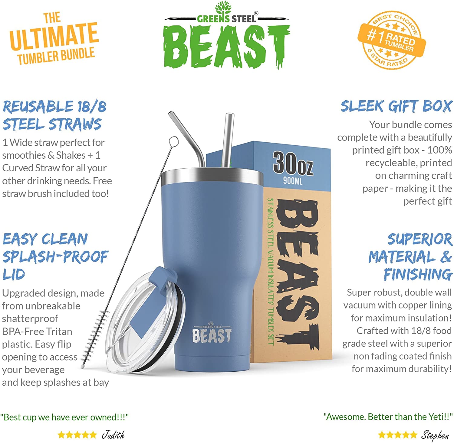 With so many second-rate Stainless Steel tumblers available on the market we wanted to set ourselves apart from the competition! Presenting the Beast Bundle: 1 Pure 18/8 food-grade stainless steel curved straw & 1 Closable Sliding Spill Resistant Shatterproof Crystal Clear BPA Free Lid, all presented in a beautiful Gift Box.