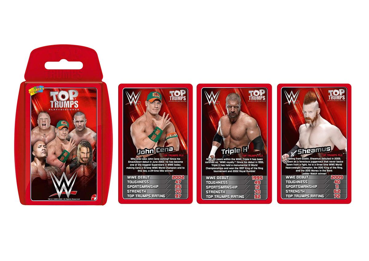 Ανέβα στο ρινγκ με 30 από τους αγαπημένους σου WWE Superstar! Ποιος είναι πιο ανθεκτικός από τον Brock Lesnar; Ποιος είναι πιο αθλητικός από τον John Cena; Ποιος είναι πιο δυνατός από τον Undertaker; Ανακάλυψέ το σε αυτή την έκδοση του Top Trumps!