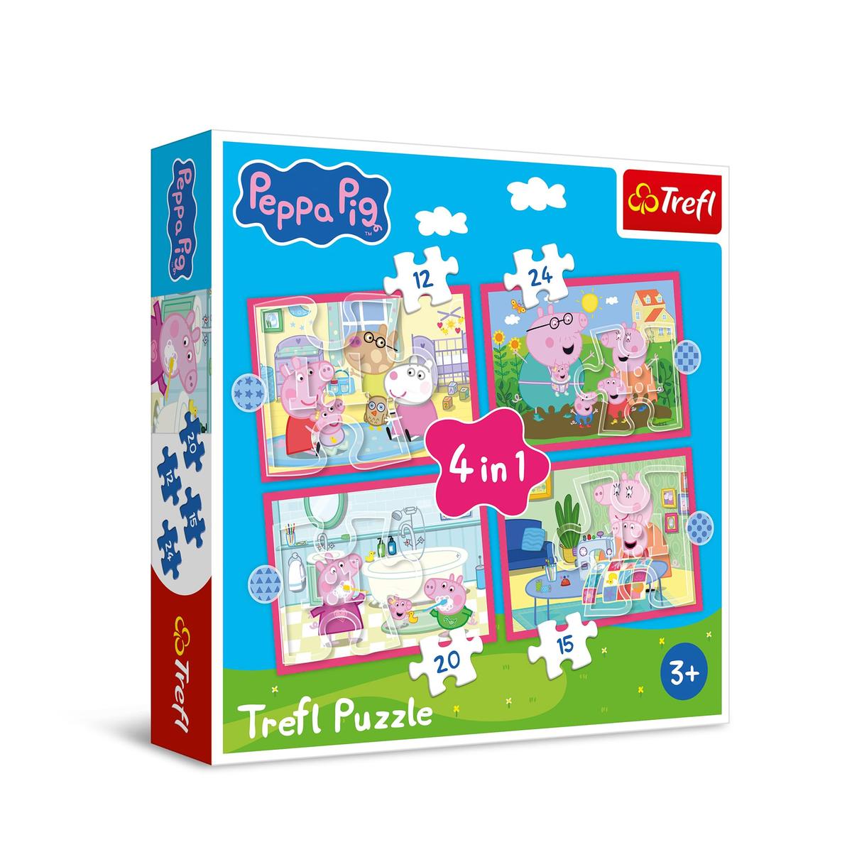 Puzzle 4 σε 1 (12,15,20,24) - Peppa αγαπά τις περιπέτειες Trefl 34672 Peppa αγαπά τις περιπέτειες είναι 4 ανεξάρτητα puzzles για παιδιά, σχεδιασμένα με σκέψη για μικρούς φαν των περιπετειών των ηρώων της κινούμενης σειράς Peppa Pig. Μετά την ολοκλήρωση των puzzles θα δημιουργηθούν εικόνες διαστάσεων 285x205 mm. Η ποικιλία του αριθμού των στοιχείων επιτρέπει παιχνίδι τόσο για μικρότερα όσο και λίγο μεγαλύτερα παιδιά. Τα puzzles παρήχθησαν στην Πολωνία, χρησιμοποιώντας οικο