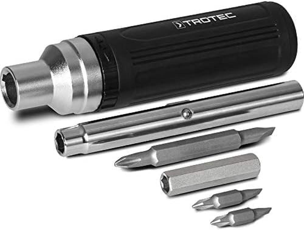 Viskas viename: tvirtas ir kompaktikas atsuktuvas su 6 antgaliais ir 3 eiakampmis galvutmisTvirtas, auktos kokybs ergonomikas atsuktuvas Trotec 9 IN 1 tiks vairiems buities darbams. Kad atsuktuvas tarnaut ilgai ir pateisint lkesius, plokio atsuktuvo antgalius (4 mm, 5 mm, 6 mm) reikt naudoti lengvesniems montavimo, surinkimo, medienos apdirbimo ar restauravimo darbams. Kryminio atsuktuvo antgalius (PH0, PH1, PH2) galima naudoti remontuojant dviraius, motociklus, elektroninius prietaisus. eiakamps atsuktuvo galvuts (1/4"", 5/16"", 3/8"") puikiai pasitarnaus dirbant su universaliais medienai arba metalui tinkaniais vartais.Taip pat galima urakinti atsuktuvo ranken, kad prireikus bt galima dirbti, kaip ir su standiu atsuktuvu. Rankena padengta guma, todl rank patogu valdyti.Privalumai:Ergonomikas atsuktuvas su 9 skirtingais antgaliais;360 rankenos sukimo kampas (minimalus grimo kampas 14,4);Paprasta antgali jungties sistema;Rankena padengta guma, todl rankis neslysta i rankos, patogu valdyti;Pagamintas i aukiausios kokybs ranki plieno;Pakeiia 9 atskirus atsuktuvus arba verliarakius.Technins savybs:Kryminio atsuktuvo antgalis: PH0, PH1, PH2;Plokio atsuktuvo antgalis: 4 mm, 5 mm, 6 mm;eiakamps atsuktuvo galvut: 1/4"", 5/16"", 3/8"