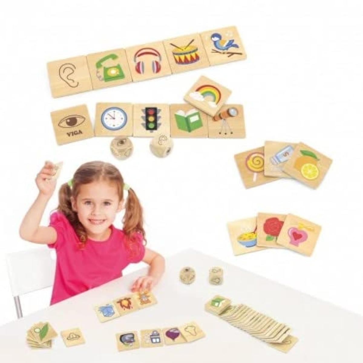 Drewniana ukadanka do nauki i sortowania zmysw. Zadaniem dziecka jest przyporzdkowa przedmioty do wybranych zmysw. Obrazki przedstawiaj wiele przedmiotw codziennego uytku np. mi, samochd. Cao wykonana jest z drewna i pomalowana nietoksycznymi farbami. W doczonej instrukcji propozycje wariantw dla jednej osoby jak i kilku osb oraz w zrnicowanym poziomie trudnoci.Charakterystyka:- cao wykonana zostaa z drewna,- pozwala dzieciom na spdzenie czasu oraz nauk przez zabaw,- pomalowana nietoksycznymi farbami przez co jest bezpieczna dla dziecka.Zabawka zawiera:- 5 pytek bazowych (podstawowe zmysy: oko- wzrok, rka- dotyk, nos- wch, usta-smak, ucho- such),- 30 pytek z kolorowymi obrazkami do dopasowania,- 2 kostki,- instrukcj.Zabawka rozwija:- wietnie rozwija spostrzegawczo u dziecka,- logiczne mylenie,- ma motoryk,- koncentracj,- koordynacj wzrokow.VIGA jest mark zarejestrowan w 2003 roku lecz ju obecn w ponad 60 krajach na wiecie. Ich innowacyjne pomysy zdobyy uznanie min. w Europie, USA dalekiej Australii oraz Japonii. Zaoyciele firmy zwrcili uwag na wyniki bada wskazujcych na zwizek pomidzy zabaw i uczeniem si we wczesnych latach rozwoju dzieci. Aby pomc rodzicom oraz placwkom edukacyjnym w wychowywaniu dzieci i ratowa ich przed wirtualnym wiatem, ktry w duym stopniu moe wypaczy rzeczywisto. Producent oferuje innowacyjny asortyment wykonany z naturalnych tworzyw uzyskanych podczas ekologicznych procesw produkcji. Bezpieczestwo i jako produktw drewnianych to priorytet dla VIGI, producent zadba o to aby farby, ktrymi maluj zabawki speniay normy bezpieczestwa EN71 oraz ASTM.