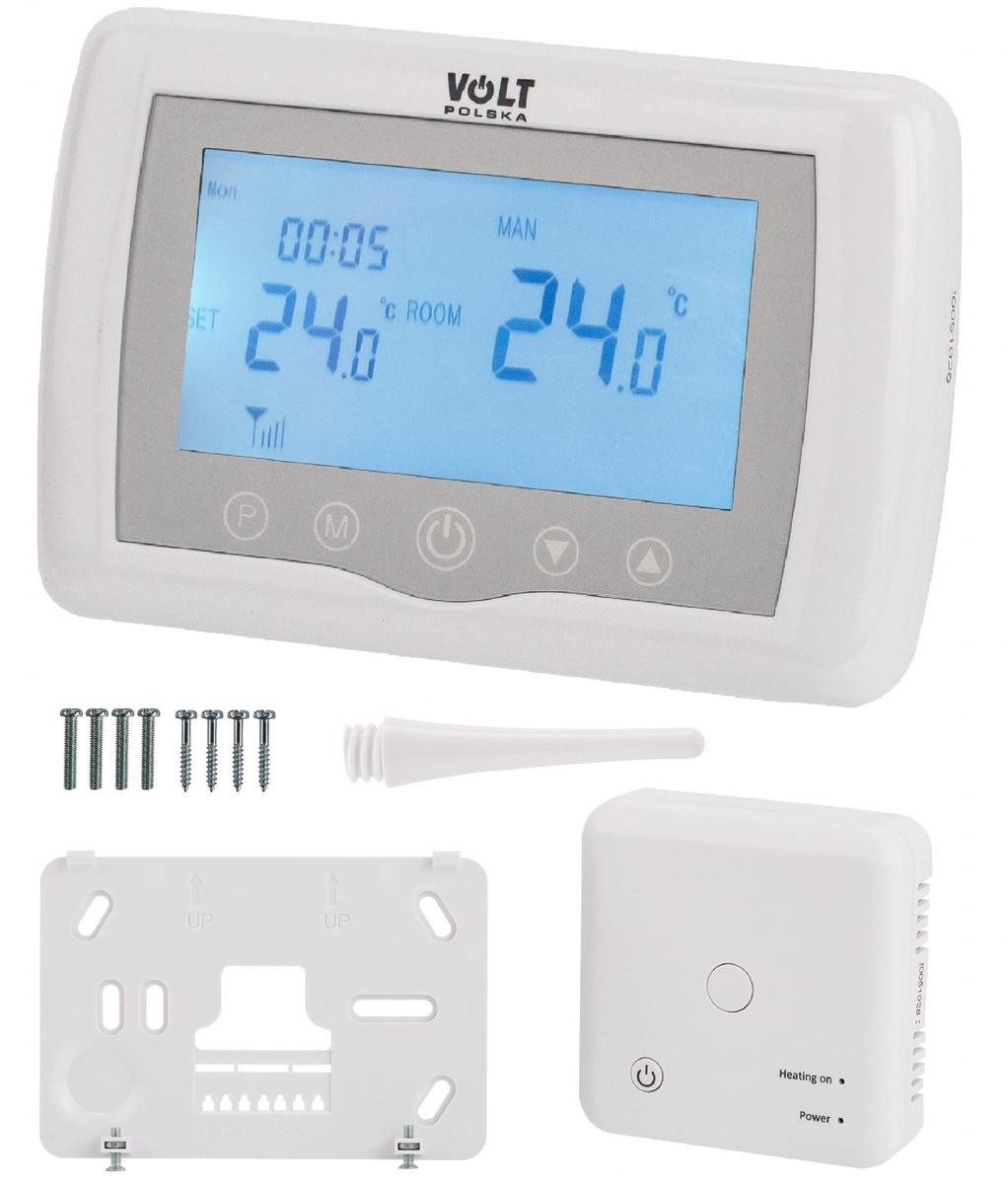 Termostat Volt Polska Comfort WT-08 radiowy + Wi-Fi Najwaniejsze cechy Duy i czytelny wywietlaczKompaktowe rozmiary termostatu i odbiornikaProgramowalne 4 cykle w cigu dniaProste sterowanieTryb otwartego okna""Moliwo montau na cianie oraz postawienia na nceWysoka jako wykonania Przeznaczenie Termostaty VOLT POLSKA z serii WT i HT to urzdzenia przeznaczone do regulacji temperatury w ukadach centralnego ogrzewania. Sterowniki z tej serii umoliwiaj zdalne (Wi-Fi lub radiowo) lub lokalne zaprogramowanie trybw pracy. Termostat utrzymuje temperatur wedug ustawie programu i zaprogramowanego czasu, co obnia koszty zuycia energii np: podczas nieobecnoci uytkownikw w domu. Opis wywietlacza Wskanik bateriiTemperatura zmierzonaCyklUstawienia temperatury i parametrwWcz/wyczWybr trybuPrzycisk programowaniaWskanik grzaniaTemperatura ustawionaZegarDzie PRG TRYB PROGRAMOWALNY, USTAWIENIE CYKLI Przytrzymaj duej przycisk P aby wej do ustawie PRG. Dni tygodnia (poniedziaek-niedziela) odpowiadaj cyfrom od 1 do 7, kady dzie ma moliwo ustawienia czterech cykli(1-4). Przyciskiem P przechodzimy do kolejnych ustawie. Godziny, oraz temperatury kadego cyklu mona ustawi w nastpujcych krokach:1) Nacinij przycisk P I przytrzymaj przez 3 sekundy, wywietlacz czasu zacznie miga, zmie warto za pomoc przyciskw i .kade nacinicie to 15min)2) Nacinij przycisk P, wywietlacz temperatury zacznie miga, ustaw temperatur za pomoc przyciskw i .3) Nacinij przycisk P by przej do nastpnego okresu. 4) Ustawienia innych okresw odbywaj si tak samo. Specyfikacja techniczna Zasilanie nadajnika2* baterie AAAZasilanie odbiornika230V Max 10AZakres ustawie5~35 st.CZakres pracy0~50 st.CWilgotno wzgldna85%PodwietlanieBiaeSensorNTC 10K, 3950ohm przy 25st.CCzuo 0.5 st.CKlasa ochronyIP30ObudowaABS UL94-5