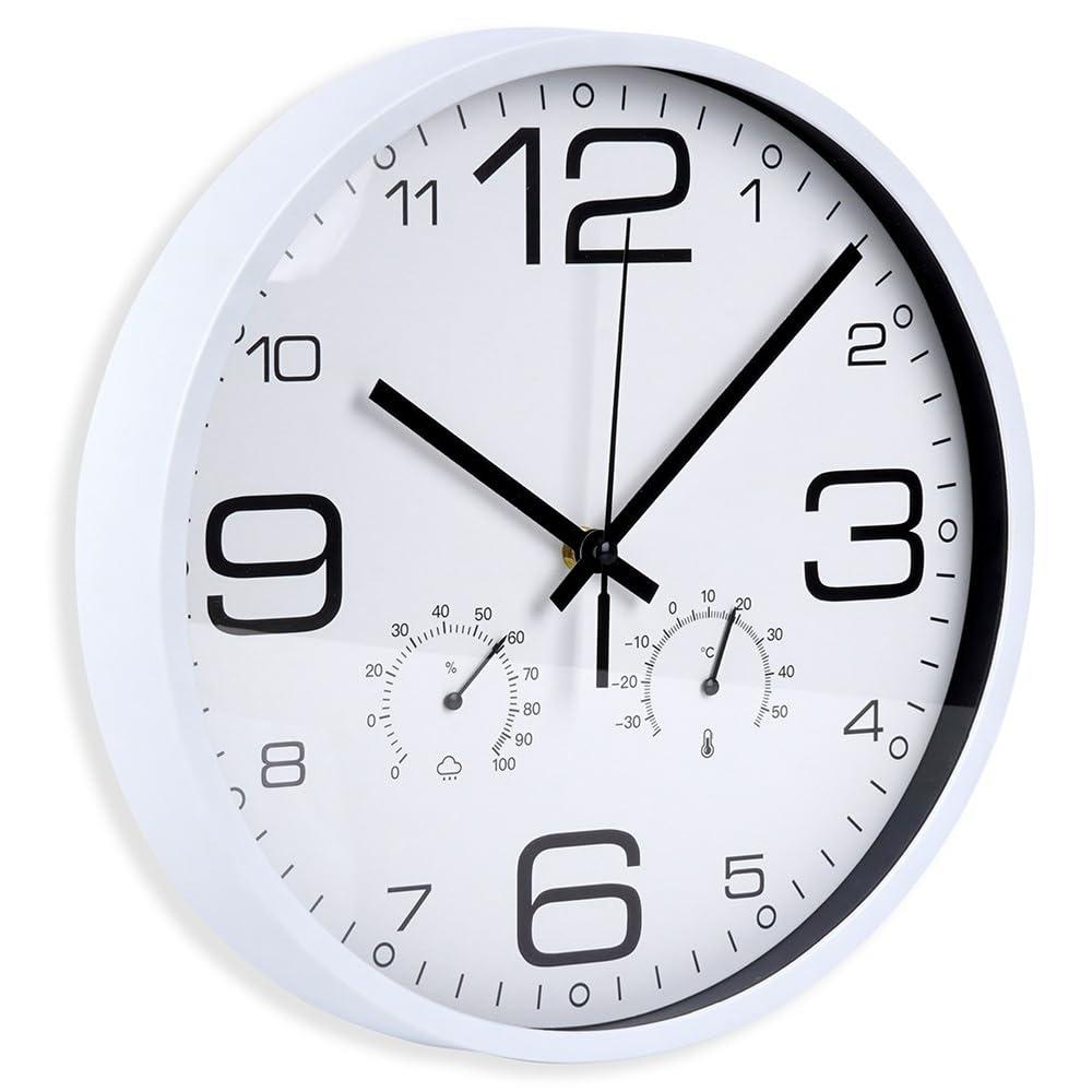 Wall clock with a weather station function, 30.5 cm. Large, clear, with built-in thermometer and hygrometer. Modern design, easy installation. Black hands on a white background.